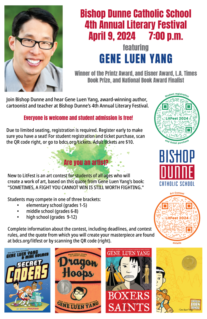 This year’s speaker is Gene Luen Yang. An award-winning graphic novelist and illustrator, Yang is also a former Catholic high school teacher. He served as the Library of Congress’ fifth National Ambassador for Young People’s Literature. While Ambassador he created a program called “Reading Without Walls” to encourage students to read books that they might not normally choose on their own.